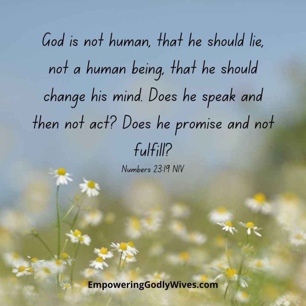 God is not human, that he should lie, not a human being, that he should change his mind. Does he speak and then not act? Does he promise and not fulfill? (Numbers 23:19 NIV)